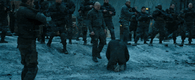 War, with its emphasis on a "Human's Last Stand" (led by a Col. Kurtz-like Woody Harrelson) has action aplenty and food for thought, as well. That's in keeping with the entire series, which has always been satirical, often heavy-handedly so. This prequel series of Rise..., Dawn..., and War... has been more cunning, and far more subtle, often defiantly so. One of my favorite shots of the three films is in War... where a captured Caesar stands up for his troop in their captivity and resists, taking the whipping that one of his followers started to endure. The weakened ape is dragged to McCullough who stares at him, mutters "Jesus Christ, you are impressive" and orders him to order the apes back to work. When Caesar refuses, he takes his gun and points it Caesar's forehead...and he defiantly leans into it, staring his oppressor down. That is powerful stuff, more than explosions, more than fire-power, more than mega-tonnage.