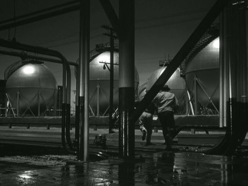 camera pans with them as they start running away from the flaming area. Off-screen sound of terrific explosion. The area is all lit up as they continue to run for cover.