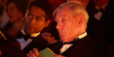 But, one shouldn't review what isn't there, one should review what is. What we've got is a character study with a little bit of blackmail/murder thrown in. Jimmy Erskine (Ian McKellen) is a renowned theater critic for London's Daily Chronicle, known for his bitchy reviews scratched out with a poison pen (and typed up for submission by his assistant, played by Alfred Enoch). Jimmy relishes his job and his high-handed witticisms ("I do not enjoy the theater. I am the chief drama critic of the Chronicle!") and the perks of having his reserved seats at the theater and reserved table at the club, but his publisher, the Viscount David Brooke (Mark Strong)—having taken over the paper from his late father—has reservations of his own and would like Jimmy to "tone it down. More beauty. Less beast!"Jimmy, though, has high standards—in everything but the "rough trade" he dabbles in—and between his lack of cooperation in kinder, gentler reviews and his frequent violation of the "morals clause" in his contract, he finds himself sacked. The Viscount has had enough of the paper's "old guard" and wants to bring in fresh blood. For Jimmy, being a pensioner is not enough to keep him in the decadent lifestyle that he's become accustomed to. So he hatches a plot.