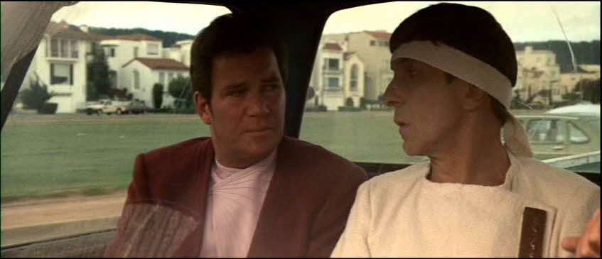 The results were some of Trek's best moments, funny and loose and firing on all thrusters, particularly this scene, between Admiral Kirk (the energetically eccentric William Shatner), Captain Spock (Nimoy) and cetologist Gillian Taylor (Catherine Hicks, a fine mercurial actress—check out the suspicious look she gives Spock in this scene). At this point in the story, having returned-from-the dead ("You really have gone where no man has gone before" says Dr. McCoy, somewhat inaccurately), and whizzed through his Vulcan training, Spock is still learning human idiosyncrasies (particularly Kirk's) and is playing "catch up" with their penchant for "winging it" (particularly Kirk's—hence the "colorful metaphor" remark, which Spock has learned humans employ to make sure their words are being heard...by swearing). As everybody from the future is learning the ropes, he's in good company, but "ancient" Earth is particularly mystifying for the "born-again" Vulcan. Shatner's and Nimoy's timing and interplay here are exquisite, mined for wit and sub-text.