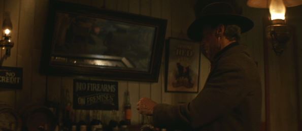 Rubinek tells the story of writer David Webb People's (The Day After Trinity, Blade Runner) weeping after a guest-screening of Unforgiven, explaining with unaccustomed surprise and relief that Eastwood stuck to the script. Well, he did and he didn't. Oh, the particulars are there, but some of the dialogue is different (things not used are crossed out and substitutions are in green font). Some of Peoples' rougher language was excised—especially things that might give one...pause...and take one "out" of the scene. Eastwood's Munny makes a bigger deal of making sure the writer, Beauchamp, isn't armed, insisting he hand over a rifle. And the way Eastwood stages it, Munny is already preoccupied with making his escape, having "gotten away with" a close-quartered shoot-out in the saloon (rather than wasting time "jawing" with Beauchamp). That's practical.